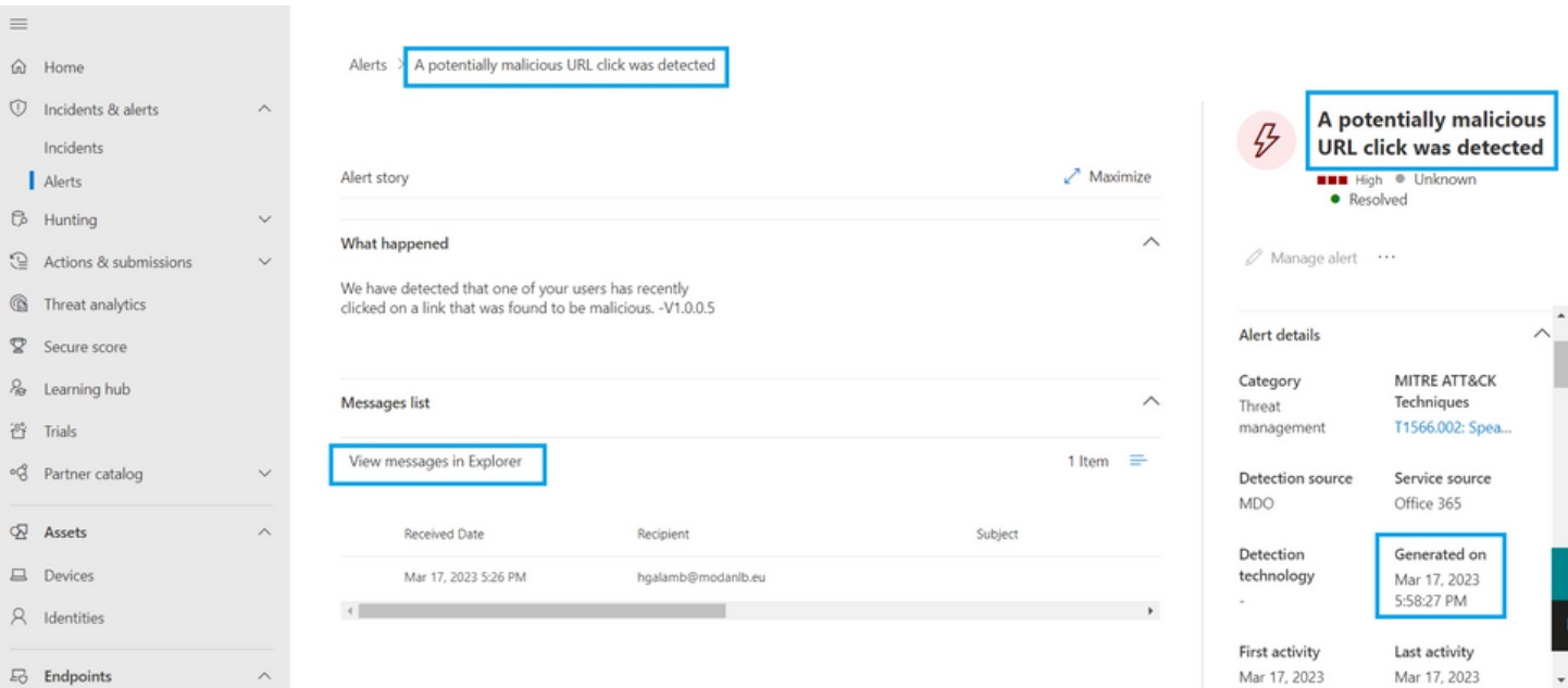 1️⃣ A potentially malicious URL click was detected: When a user clicks on a malicious URL, Microsoft Defender for Office 365 scans it, checking for past threats to establish a reputation. If it identifies an attack, an alert is sent to security teams.
