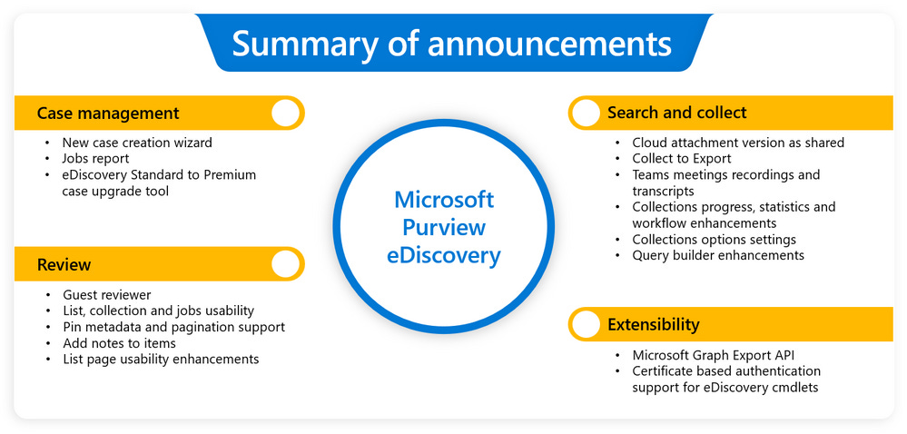 📣 Exciting news! Microsoft Purview eDiscovery (Premium) is introducing new capabilities to drive efficiency, improve workflows, and reduce costs for litigations and investigations. As digital transformation demands grow, organizations face challenges in managing Electronically Stored Information (ESI) for eDiscovery purposes. Microsoft Purview eDiscovery is here to help.